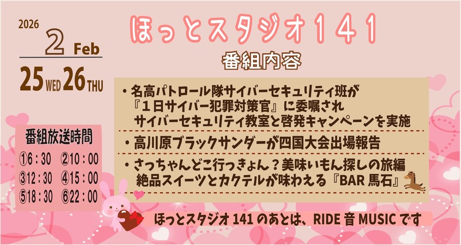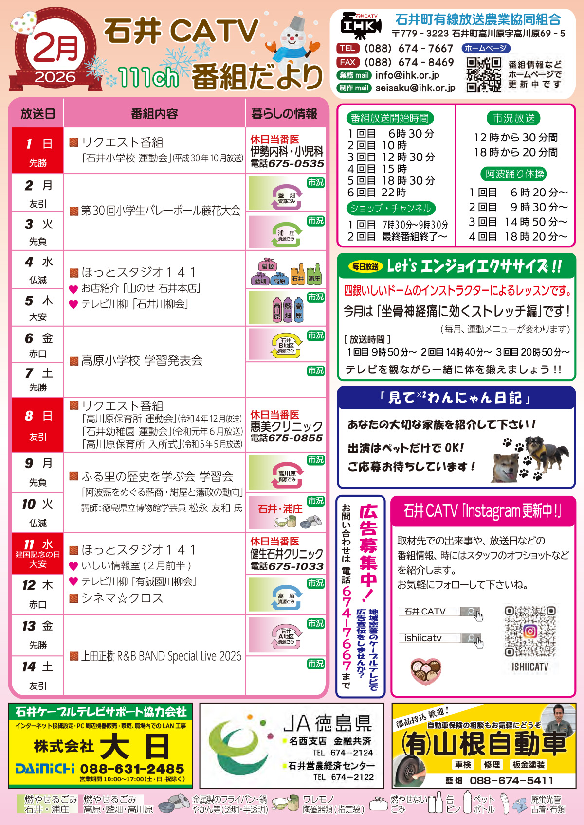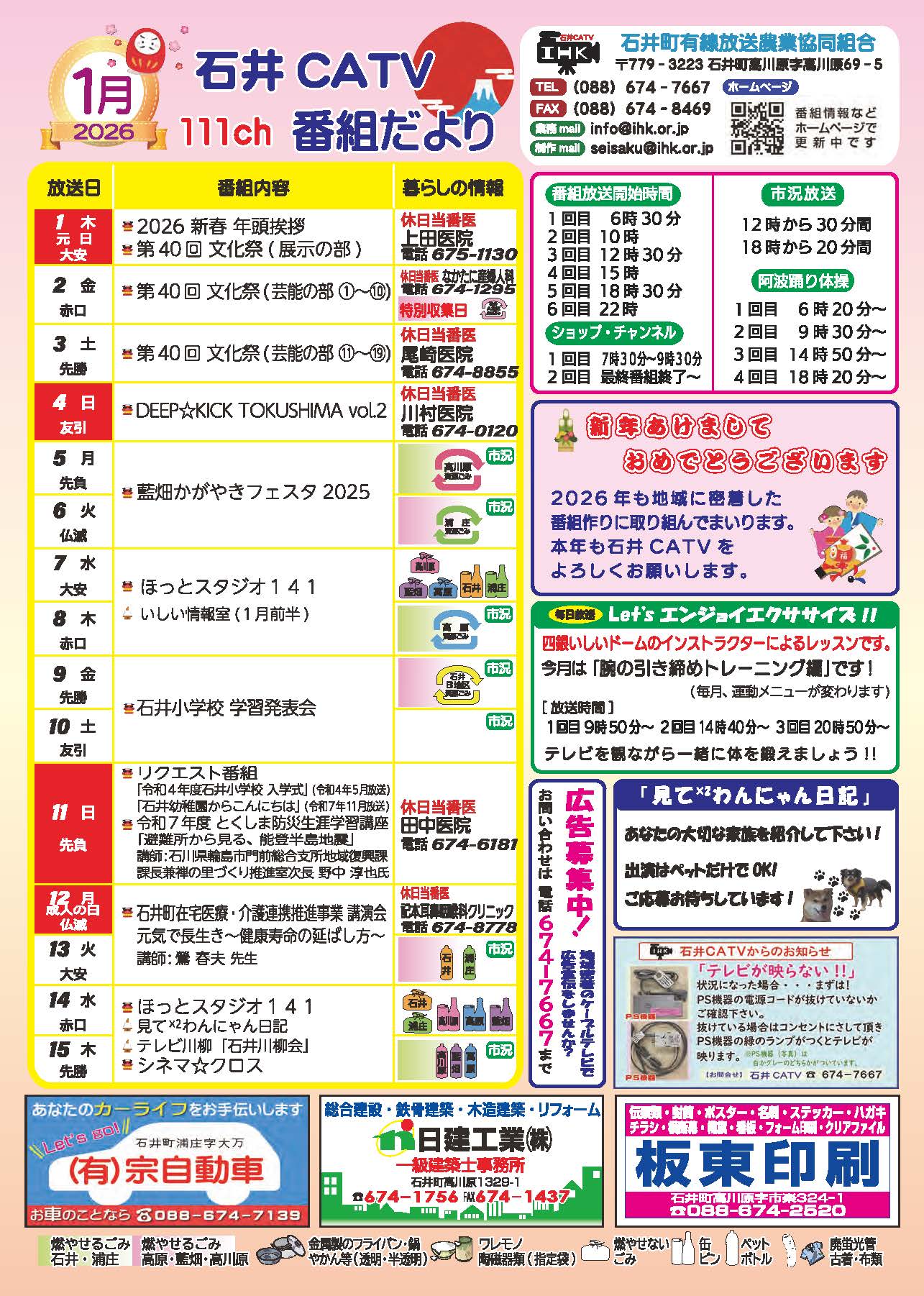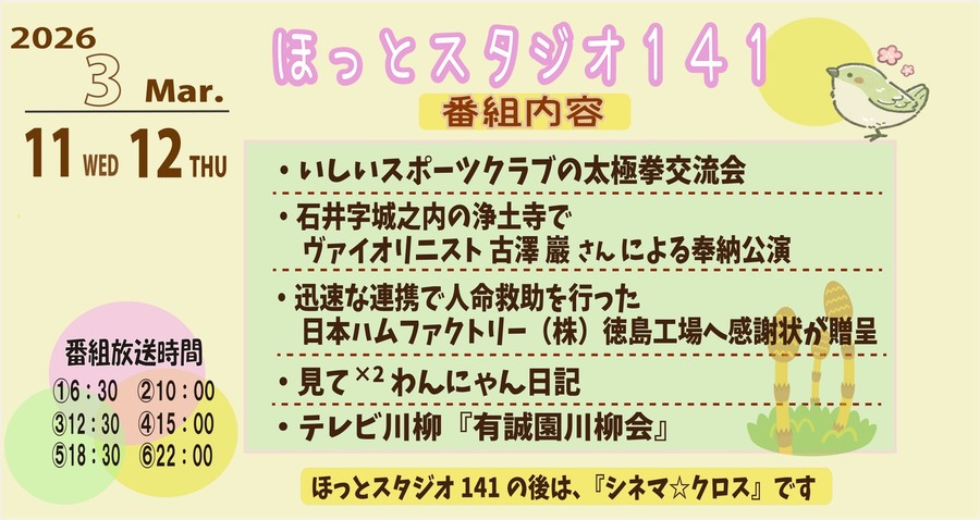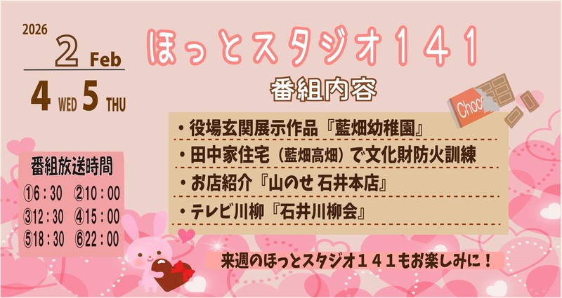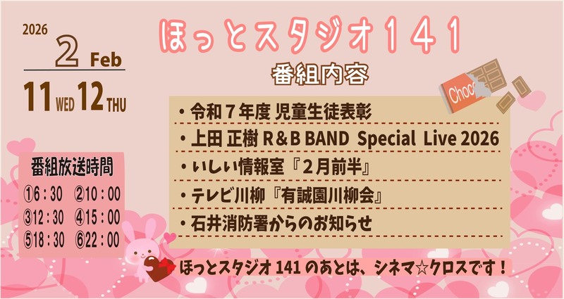 石井CATVでは、地域密着型のオリジナル番組を多数放送中! 最新イベント情報やホットな話題をお届けするホットスタジオ141の他、かわいい子どもたちのコーナー番組、リポーターさっちゃんがお送りする番組など、ぜひ石井CATVで石井町の素晴らしさをご堪能ください!