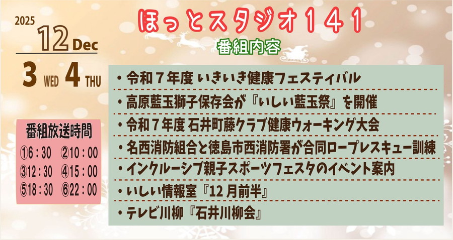 石井CATVでは、地域密着型のオリジナル番組を多数放送中! 最新イベント情報やホットな話題をお届けするホットスタジオ141の他、かわいい子どもたちのコーナー番組、リポーターさっちゃんがお送りする番組など、ぜひ石井CATVで石井町の素晴らしさをご堪能ください!