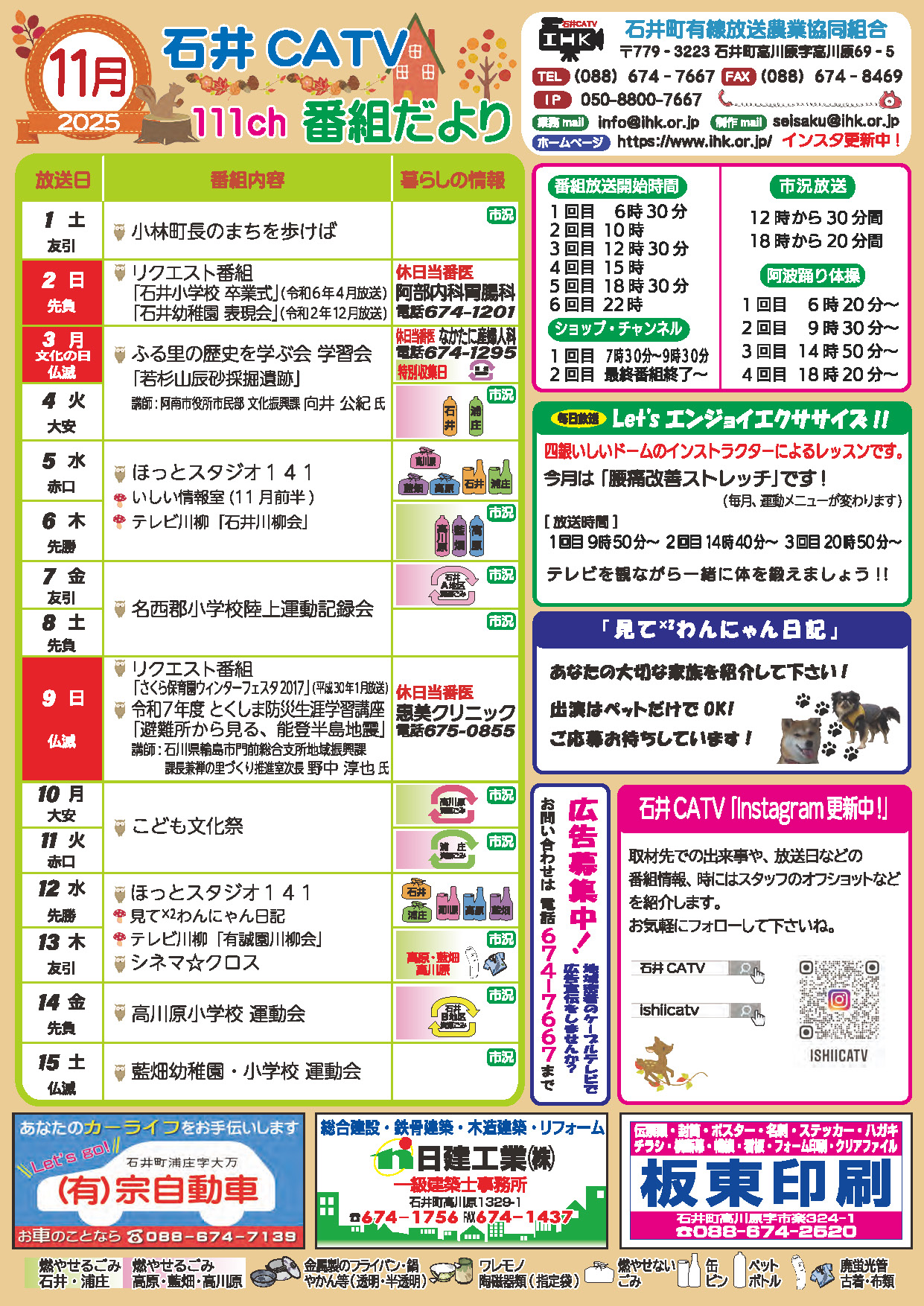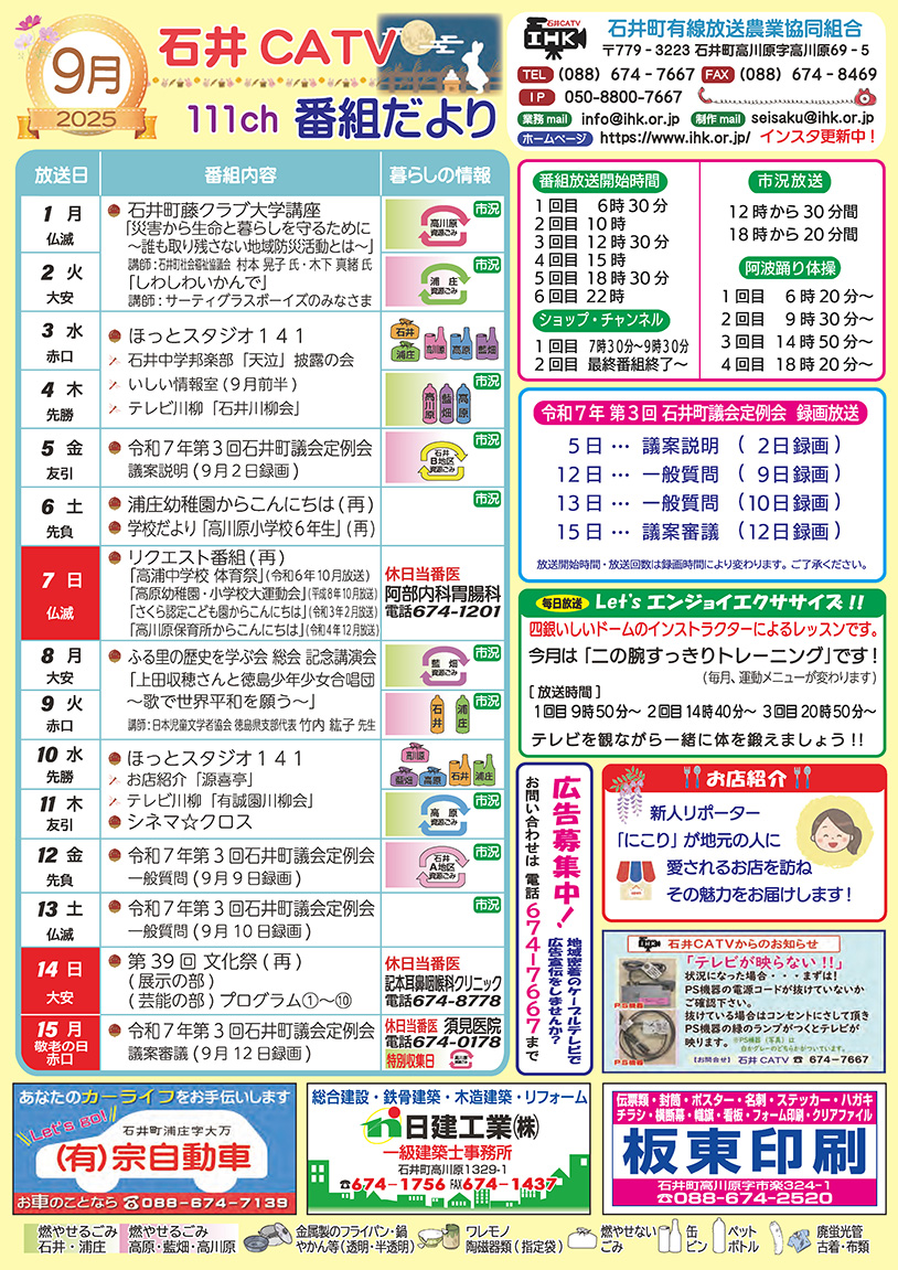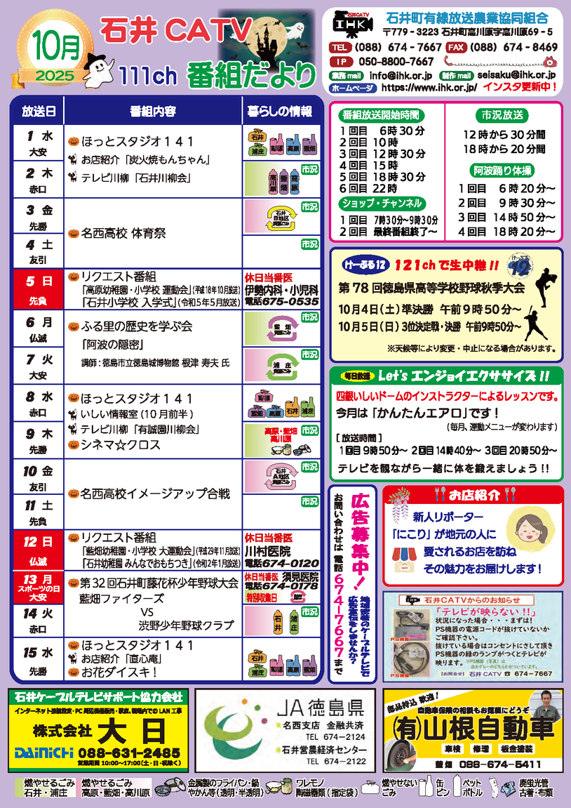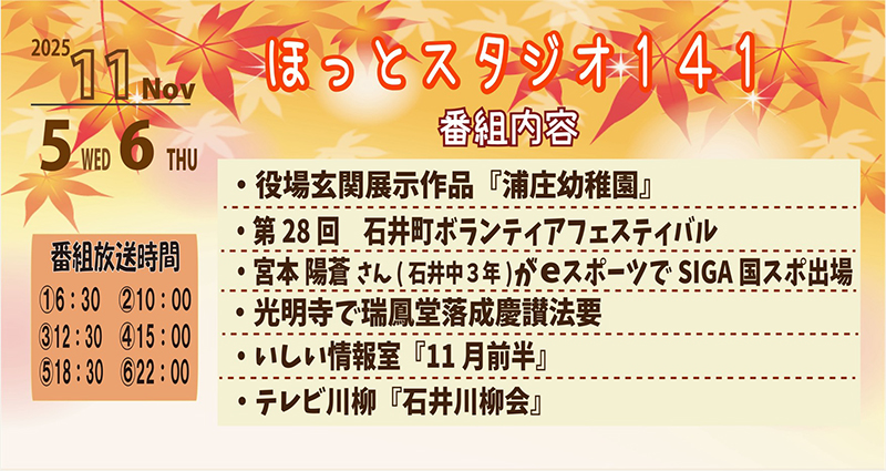 石井CATVでは、地域密着型のオリジナル番組を多数放送中! 最新イベント情報やホットな話題をお届けするホットスタジオ141の他、かわいい子どもたちのコーナー番組、リポーターさっちゃんがお送りする番組など、ぜひ石井CATVで石井町の素晴らしさをご堪能ください!